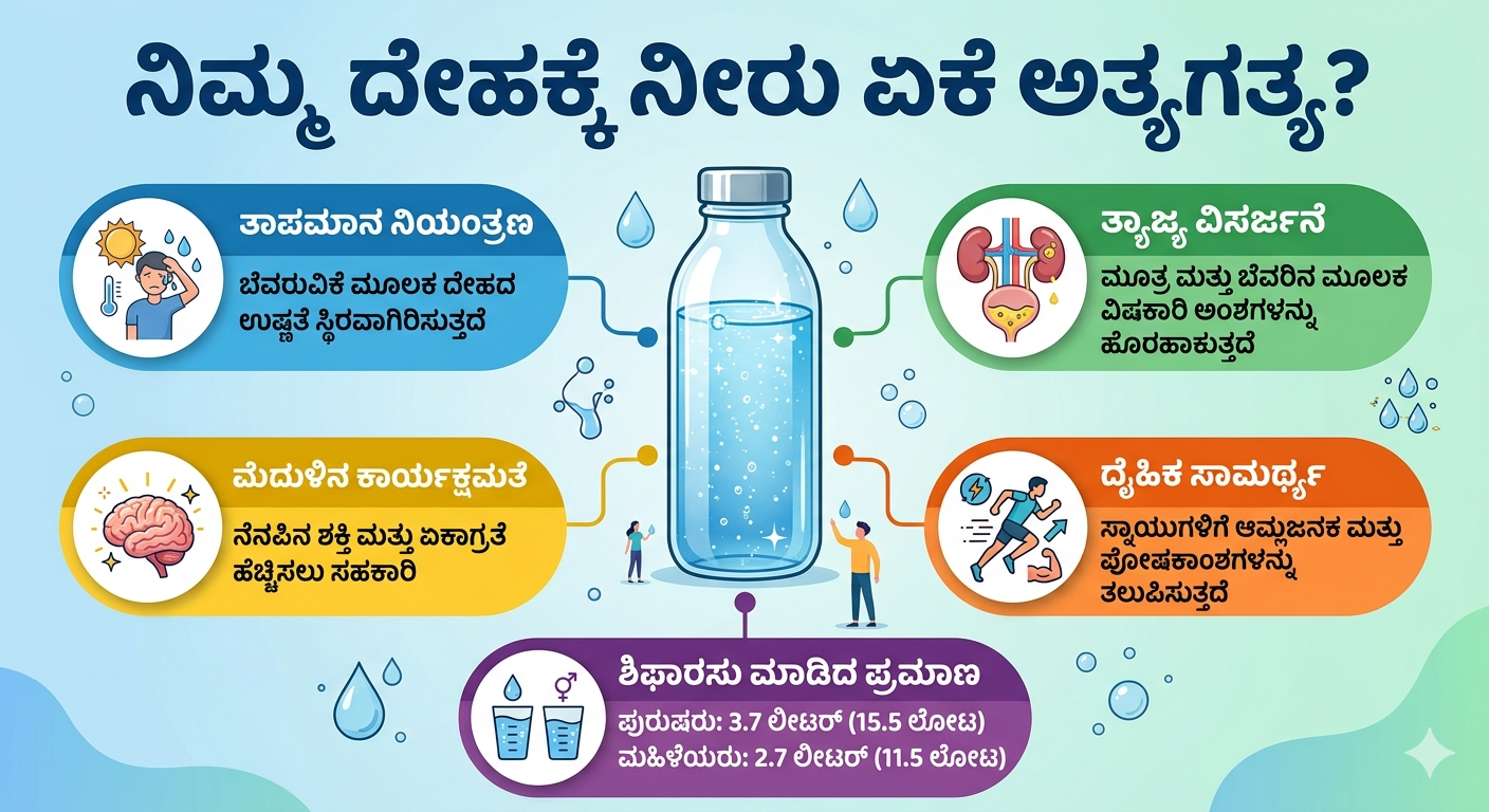 ನಮ್ಮ ದೇಹದ ಪ್ರತಿ ಜೀವಕೋಶ, ಅಂಗಾಂಶ ಮತ್ತು ಅಂಗಗಳು ಸರಿಯಾಗಿ ಕಾರ್ಯನಿರ್ವಹಿಸಲು ನೀರಿನ ಅಗತ್ಯವಿದೆ.